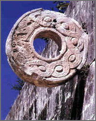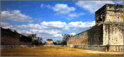Le Jeu de balle que l'on trouve sur les différents sites archéologiques de El Tajin, Monte Alban, Chichén-Itzá, etc... s'appelait chez les Mayas Toltèques le Pok-ta-Pok qui a donné son nom à un célèbre parcours de Golf à Cancun dans lequel on a retrouvé des ruines Mayas. IL est délimité par deux terrasses sauf aux extrémités, qui sont en forme de la lettre T majuscule. |