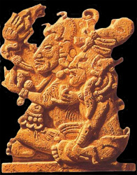 Les Jumeaux Héroïques Hun Hunahpu et Xbalanque ont été conçus de façon miraculeuse à Xibalbá où ils furent contraints par les dieux des enfers à jouer l'un contre l'autre dans un tournoi de balle. Voici l'une des légendes des Jumeaux Héroïques qui raconte le destin des deux frères jumeaux qui excellaient à un jeu traditionnel de balle. Le monde inférieur maya était un lieu terrifiant, demeure des démons et des dieux de la mort. Les principaux seigneurs Hun Came et Vucub Came dominaient Xibalbá. Les Héros jumeaux, Hun Hunahpu et Xbalanque, avaient pour destin de combattre et de vaincre Hun Came et Vucub Came. |