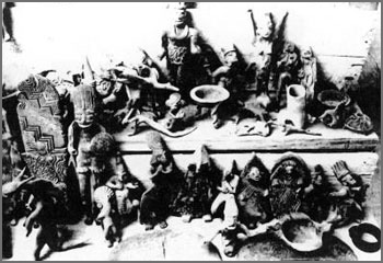 Alors qu'il se promenait à cheval le long d'un fossé près de la colline du taureau, en compagnie d'un de ses employés, un fermier nommé Odilon Tinajero, son attention fut attirée par un morceau de céramique émergeant du sol. C'était une figurine en terre cuite d'un style qui lui était inconnu. Il demanda à son employé de creuser et de lui ramener toutes les pièces similaires qu'il pourrait trouver. Tinajero se présenta quelques jours plus tard avec une brouette remplie de ces artefacts. Julsrud était stupéfait par le style et la diversité des figurines. Il passa un marché avec son employé : il lui payerait 1 peso pour toutes les figurines entières rapportées mais rien pour celles abîmées, qu'il devait quand même lui remettre ( et qu'il a conservées ). Son but visait non pas à encourager son fermier à en fabriquer ( il n'en aurait de toute façon eu, ni le temps, ni l'art et le prix était trop bas pour une éventuelle fabrication ) mais à le contraindre à fouiller avec la plus extrême précaution. Les figurines furent découvertes par groupes de 20 à 40 à l'intérieur de puits à une profondeur allant d'environ 1m 20 à 1m 80. Ce n'étaient pas des puits funéraires, on a seulement retrouvé 6 crânes lors des fouilles. Il semble, c'est tout au moins l'hypothèse émise par M. Julsrud, qu'elles aient été ensevelies à la hâte pour les protéger du pillage des premiers colons espagnols. |