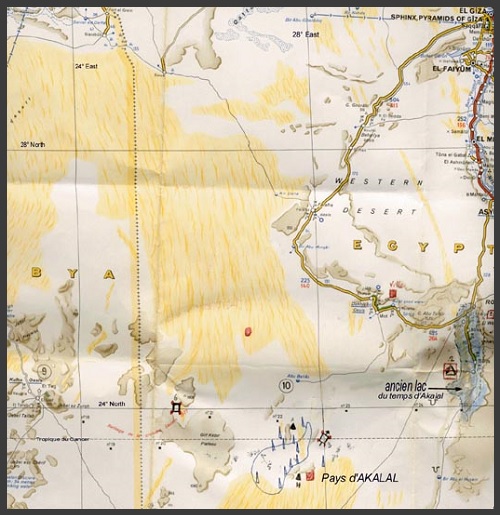 En Novembre 1981des photos radar prises par la navette spatiale américaine Columbia de la NASA, (Photos Nos. S-83-25010 et S-83-25919) révélait sur des surfaces sèches (les déserts en particulier) à quelques mètres sous les sables des images mettant en évidence des contours rocheux et des vallées enfouies, inconnus auparavant et des structures géologiques, des traces de constructions et de travaux et de lits de rivières datant de temps anciens. Un site ayant bien existé avant que le désert de sable nen prenne la place. AKALAL sétait bien trouvé dans cette partie du désert au sud-ouest de lEgypte, près de la Lybie, entre le 24° et 32° Est et le 20° et 28° Nord. La cité dAkalal, est elle-même exactement située sur le Tropique du Cancer (23°30N). Il reste à déterminer la datation ! |