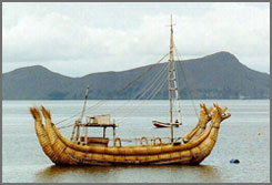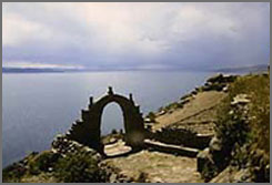 Situé à 3812 m d'altitude au centre de l'Altiplano partagé entre le Pérou et la Bolivie le Titicaca est l'un des lacs les plus hauts du monde et le seul navigable à cette altitude. Il occupe une superficie de 8340 km², une longueur maximum de 196 km et une largeur maximum de 80 km. Sa profondeur maximum est de 281 m. Sa température est pratiquement constante (11° à 20 mètres de profondeur). Ses eaux sont très légèrement salées. Il est le résidu d'un lac beaucoup plus vaste le Ballivian qui au quaternaire recouvrait une grande partie de l'Altiplano. Le lac compte une quarantaine d'îles certaines possèdant des vestiges Incas. Il y a très longtemps, le lac Titicaca était une vallée fertile peuplée d'hommes vivant heureux et tranquilles. Rien ne leur manquait; la terre était riche et leur procurait tout ce dont ils avaient besoin. Cette région est incontestablement celle où la culture indienne est restée la plus vivante. |