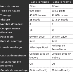 L'écrivain Morgan ROBERTSON, publia un roman racontant l'histoire du naufrage d'un navire. Ce récit, bien que datant de 14 ans avant le drâme du Titanic, en est presque une copie. Le nom du bateau de ROBERTSON était le Titan. Il mesurait 244 mètres et déplaçait 70000 tones, le Titanic, 269 mètre pour 66000 tonnes. L'ouvrage fut publié aux Etats-Unis en 1898, sous le titre "Futility", et réédité en 1912, l'année même du naufrage, sous le titre "The Wreck of the Titan". |